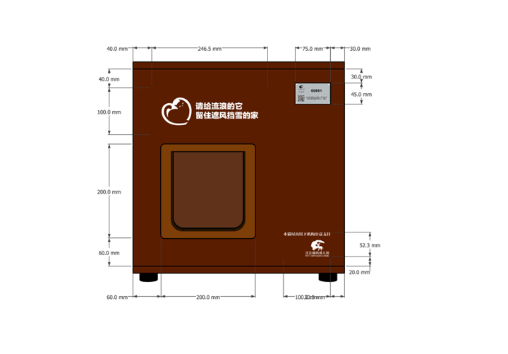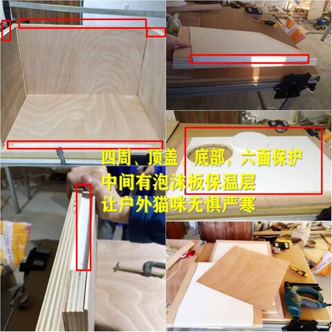 依旧是三层保温(里外E0级胶合板,中间泡沫保温层),两遍喷涂防腐木油,可以打开的顶盖,双向开的透明翻板猫门,防潮可调节高度垫脚,丝网印刷温馨标语,金属编号铭牌。