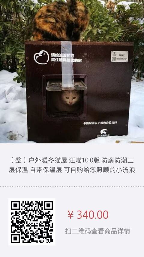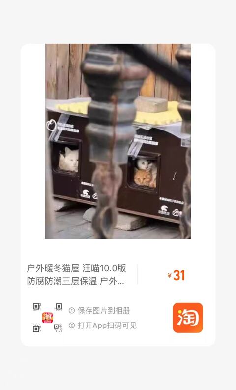 捐赠给社区流浪猫的猫屋,31元/份,只能通过淘宝支付,10份=1个猫屋。