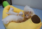 2020年4月30日,米雪顺利产下了5只小宝宝,4只雪白,1只橘黄,柔柔弱弱,甚是可爱。月子里,初为妈妈的米雪日夜守护哺育着它的孩子,喂奶、舔毛、舔屁屁……,极其负责,极其温柔,母爱情深!现在,5只小喵咪渐渐长大,可以吃猫粮了,正在学习使用猫砂。个个健康活泼可爱,每天相互追跑嬉戏,熟悉周围的小世界。米雪也渐渐从贴身呵护变成静静观察,并开始了自己的探索。